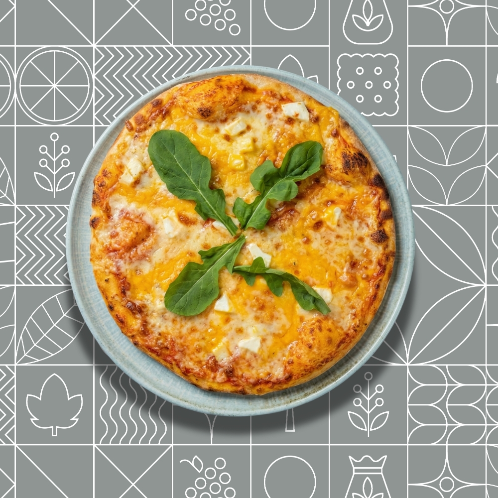 220 gr özel pizza hamurumuz, mozzarella peyniri ve fesleğen sosu ile hazırlanır. Beyaz peynir, cheddar peyniri, hellim peyniri, mozzarella eklenir.