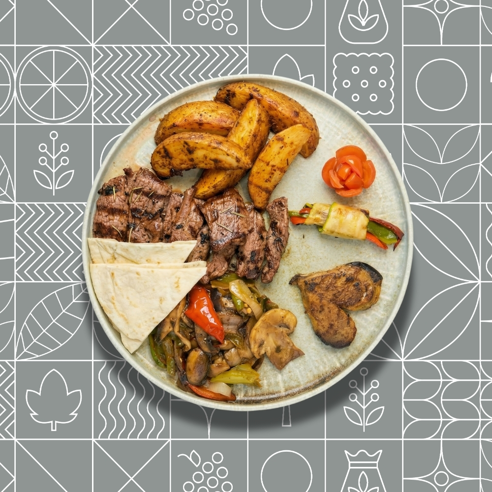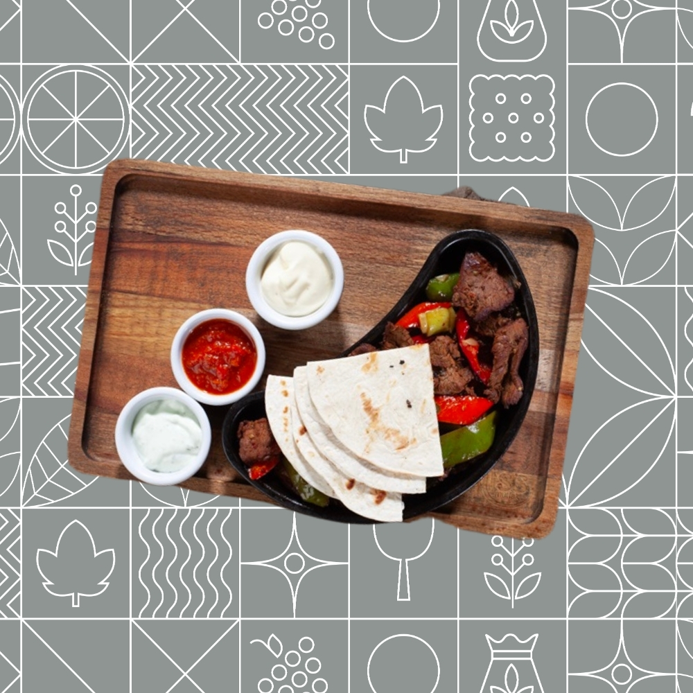 Baharatlı yaprak 180 gram bonfile eti, mantar,soğan, yeşil biber, kapya biber, Jalapeño ve fajita baharatı ile lezzet şöleni. Yanında el yapımı lavaş ve 3 özel sos (Bearnaise sos ,Ranch sos, Acı sos) ile servis edilir.