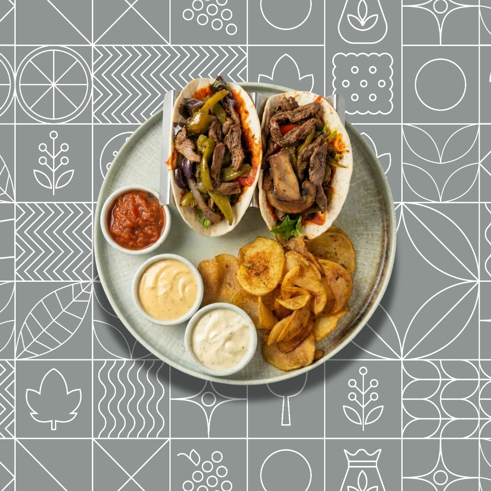 150 gram tavuk, tortilla ekmeği içinde, mantar, soğan, yeşil biber, kapya biber, meksika fasulyesi, Jalapeño ve kajun baharatı ile tatlandırılır. Yanında el yapımı patate