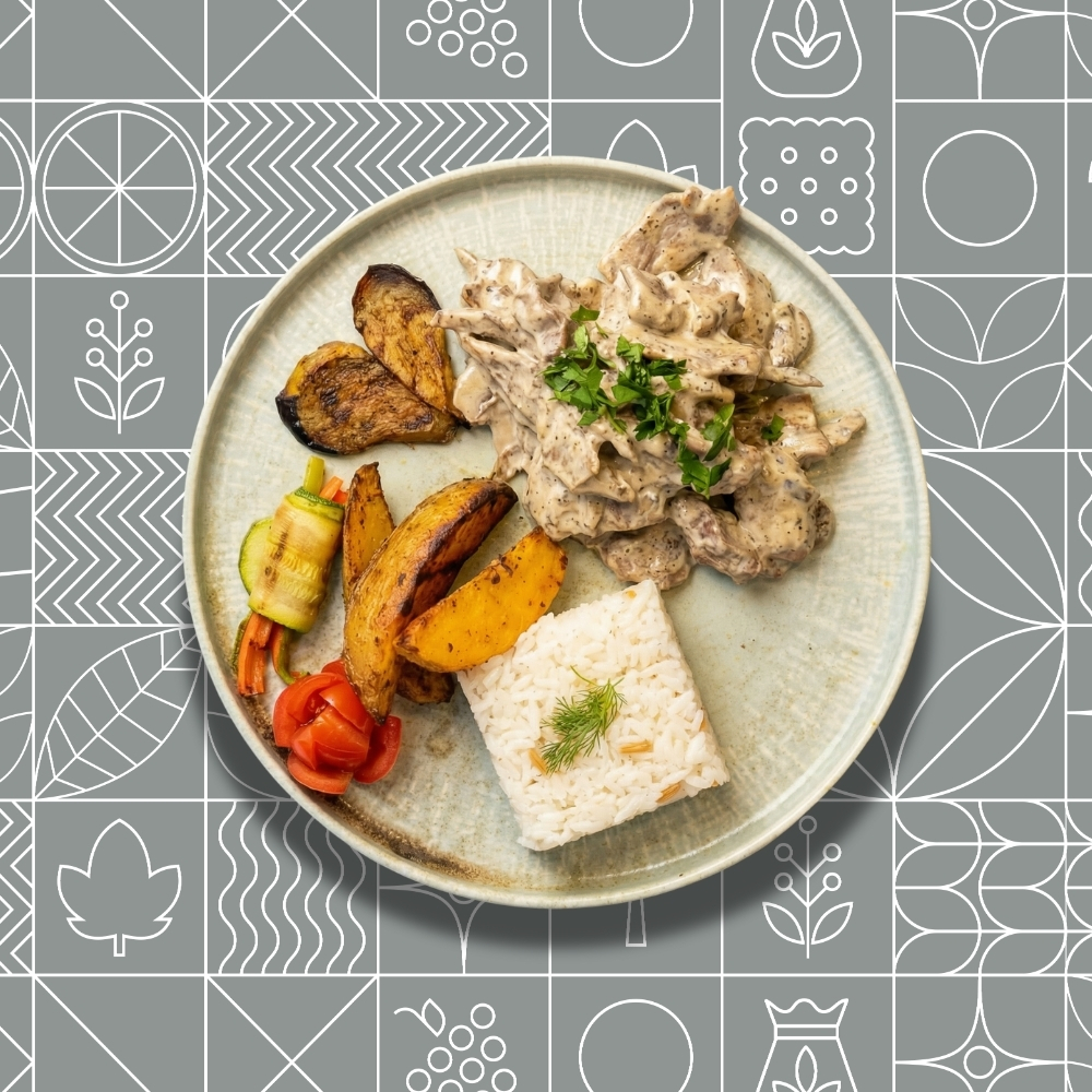 180 gram bonfile eti, mantar, soğan, sarımsak, krema ve kornişon turşu ile buluşur. Yanında pirinç pilavı, el yapımı patates kızartması. Çiçek domates ve sebze buketi ile servis edilir.