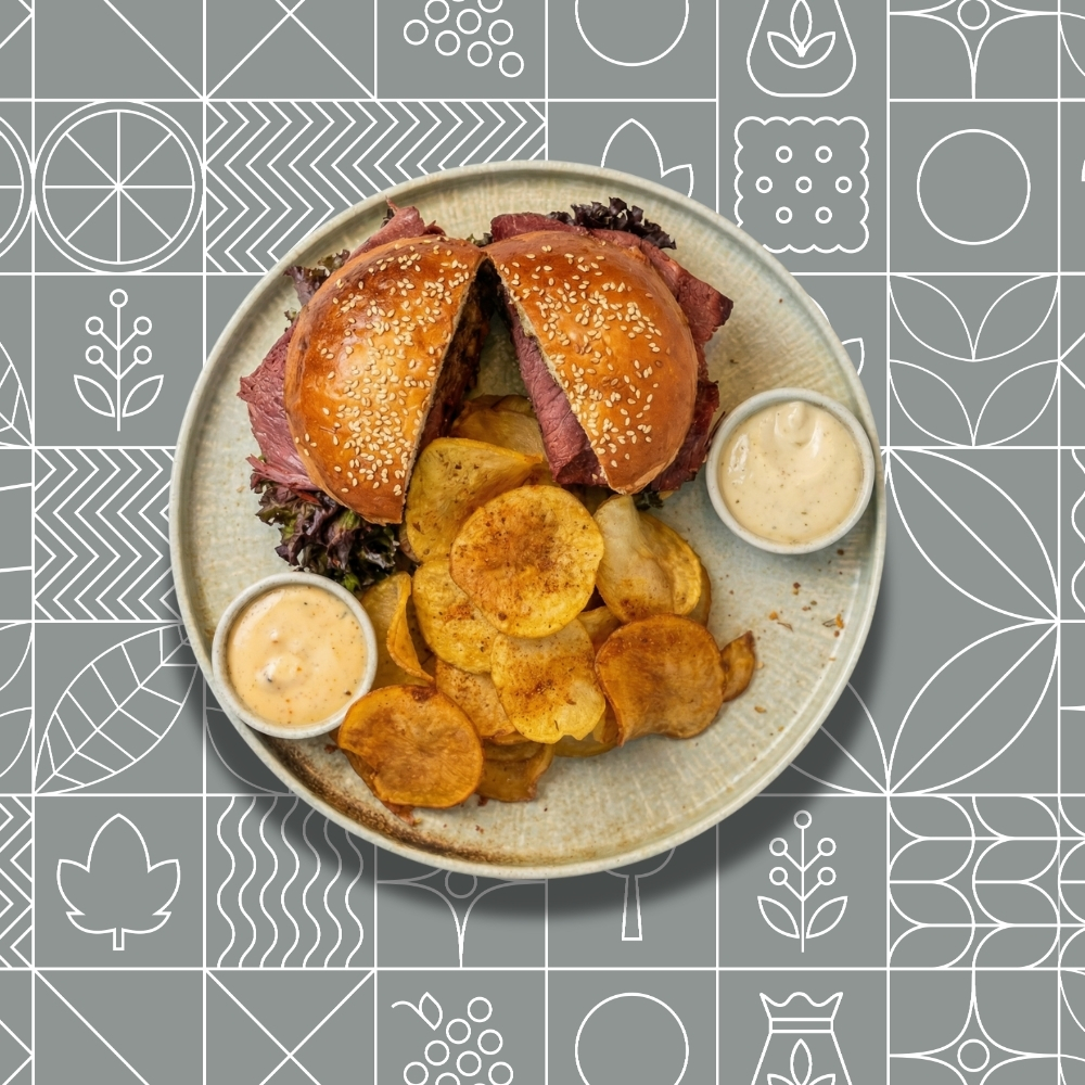 130 gram ızgara hamburger köftesi, taze kıvırcık marul, domates, kornişon turşusu, ballı hardallı sos ve özel el yapımı ekmek ile bir araya gelir. Yanında el yapımı patates kızartması ile servis edilir.