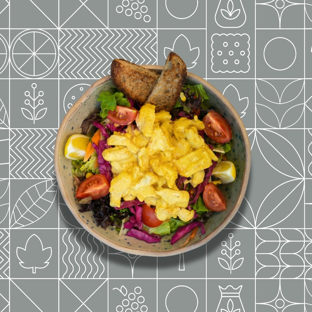 Taze mevsim yeşillikleri, mor lahana turşusu, havuç, kapya biber, dereotu, maydanoz, cherry domates, 150 gr tavuk ve özel hint sosu ile hazırlanan bu salata, limon ve zeytinyağı ile tatlandırılır.