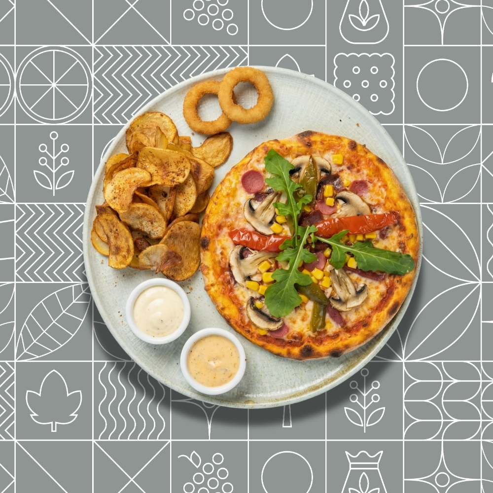 160 gr özel pizza hamurumuz, mozzarella peyniri ve özel pizza sosu ile hazırlanır. Üzerine mantar, salam, sosis, mısır, sucuk, yeşil zeytin ve siyah zeytin eklenir. Soğan halkası ve el yapımı patates kızartması ile servis edilir.