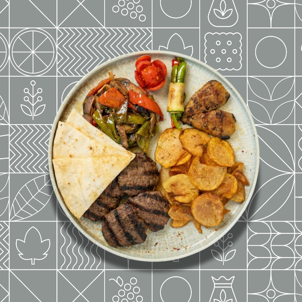 Mevsim yeşillikleri, mor lahana turşusu, havuç, kapya biber, dereotu, maydanoz, cherry domates, limon ve zeytinyağı ile hazırlanan salata, üzerine 160 gr ızgara köfte ile sunulur.