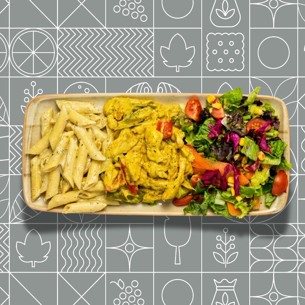 Özel köri baharatı ile marine edilmiş 150 gram tavuk krema kapya biber yeşil biber soğan, penne makarna mevsim yeşillikleri domates, mor lahana turşusu, süt mısır ile servis edilir
