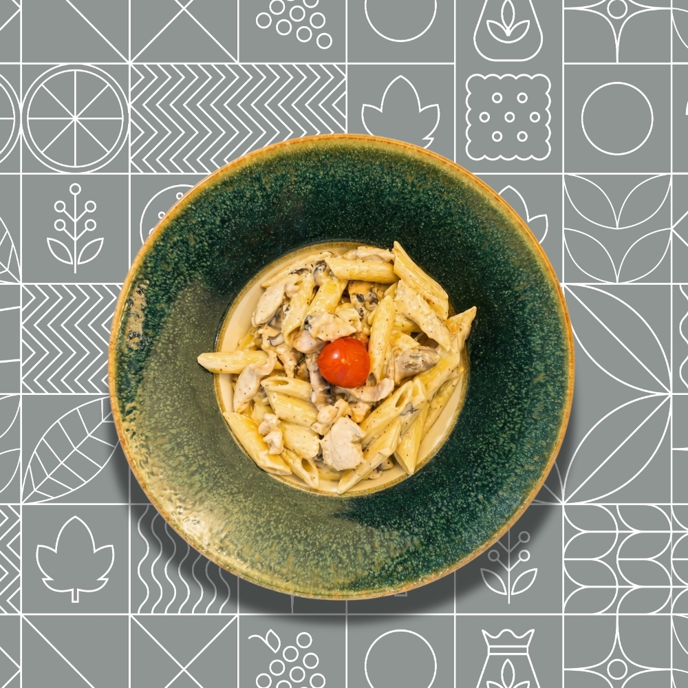 180 gram penne makarna, 150 gram tavuk, mantar, pesto sos ve krema ile hazırlanır.