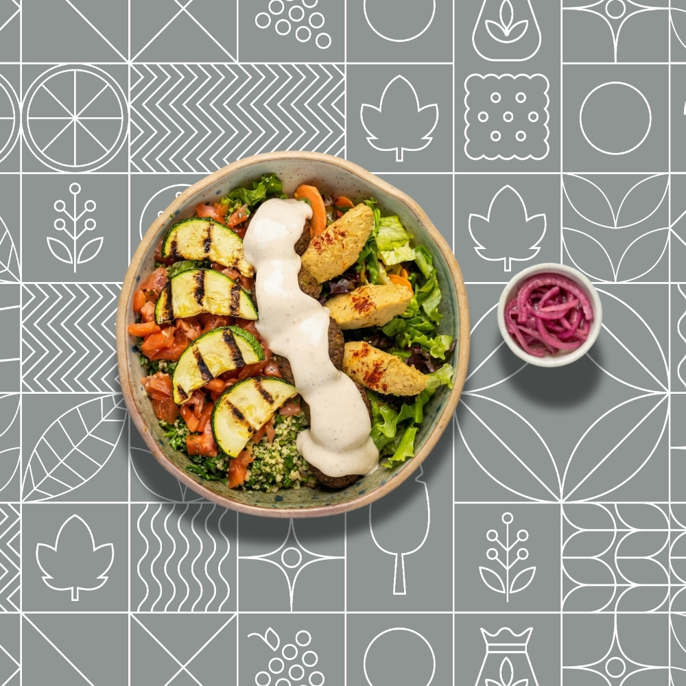Mevsim salata, tabbule, Humus, falafel, ızgara kabak, yanında mor soğan turşusu, falafelin üzerinde tahin sos