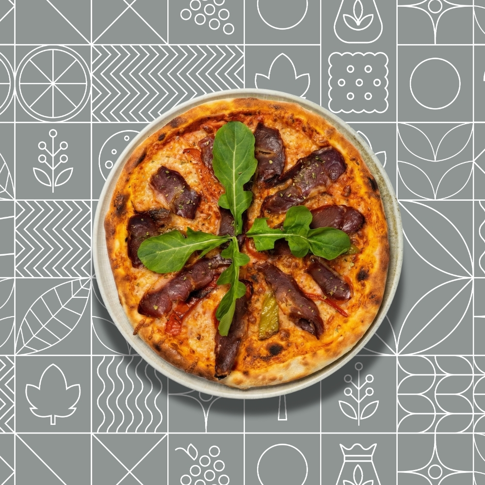 220 gr özel pizza hamurumuz, mozzarella peyniri ve fesleğen sosu ile hazırlanır. Üzerine pastırma, sucuk, bonfile eti, kırmızı biber ve yeşil biber eklenir.
