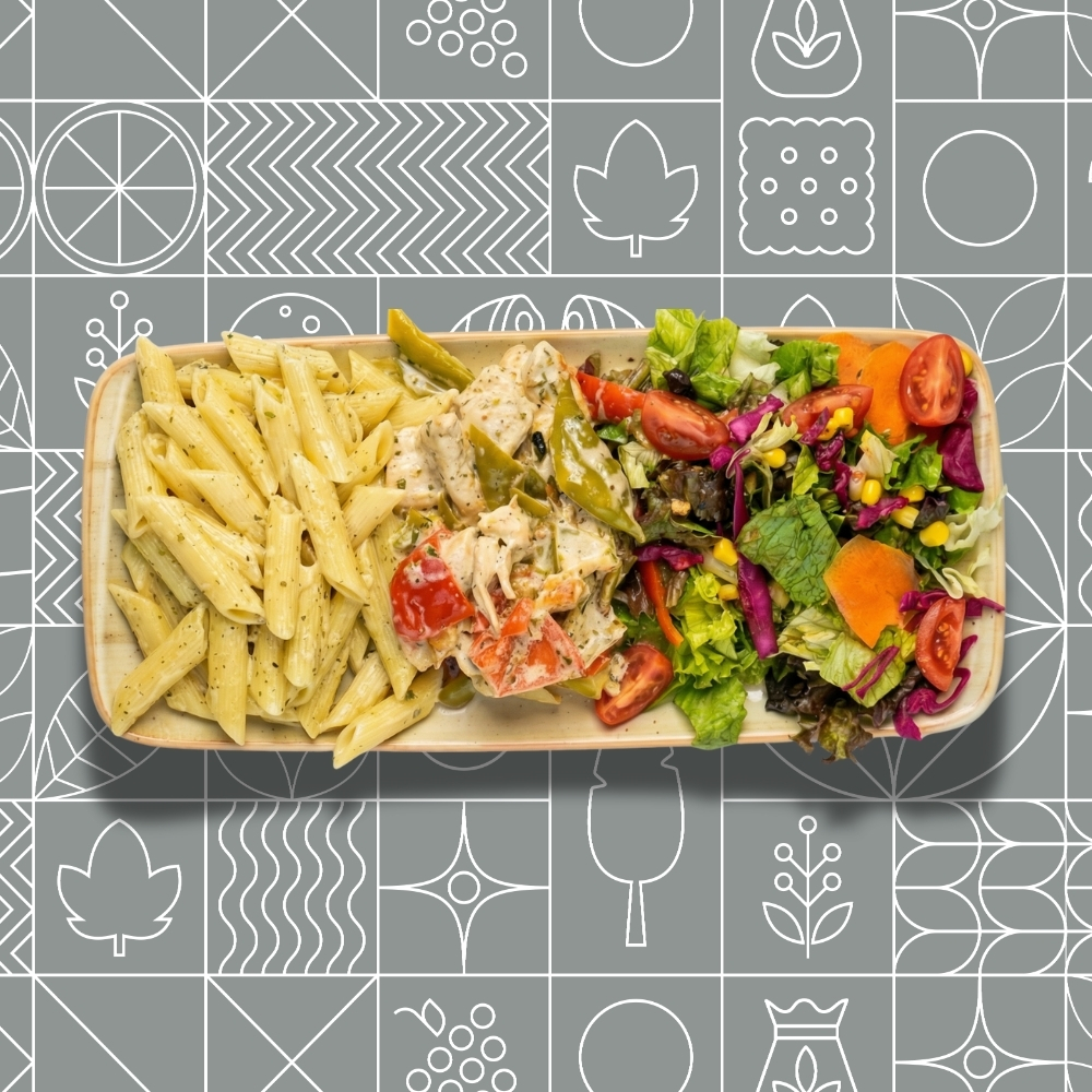 150 gram marine edilmiş tavuk, dağ kekiği krema kapya biber yeşil biber soğan penne makarna mevsim yeşillikleri domates, mor lahana turşusu, süt mısır ile servis edilir